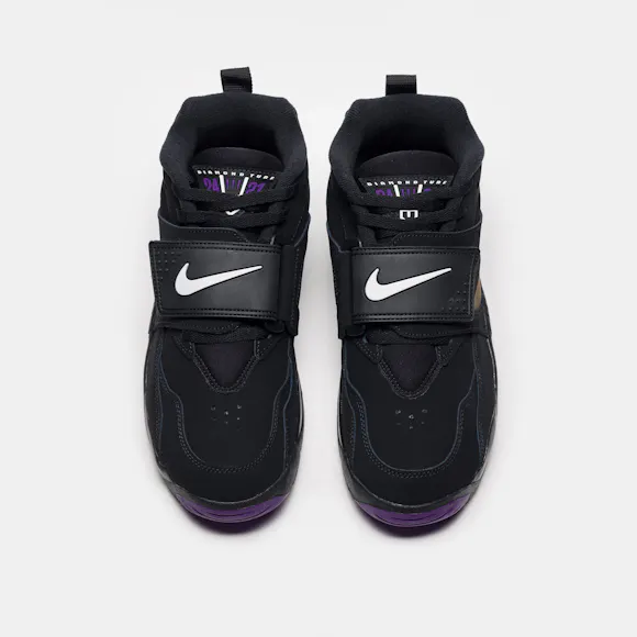 Nike mens limited edition black, white, "Club Purple" purple, and metallic gold leather high top retro cross trainer sneaker. Features: Lace-up front Premium leather upper Rounded toe Air units in heel and forefront Midfoot strap Foam midsole Textile lining Fabrication: Style # HV2282-001 Made in China