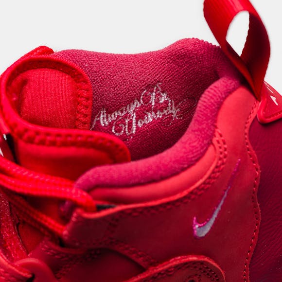 Nike mens limited edition "University Red", white, and "Red Crush" leather high top retro sneaker. Features red leather upper with nubuck overlays, touch straps, and air sole unit Features: Lace-up front Premium leather upper Nubuck overlays Rounded toe Air units in heel and forefront Midfoot strap Rubber outsole Mesh detailing Heel and tongue tabs Fabrication: Style # IF1617-600 Made in China