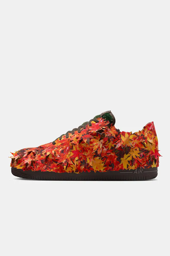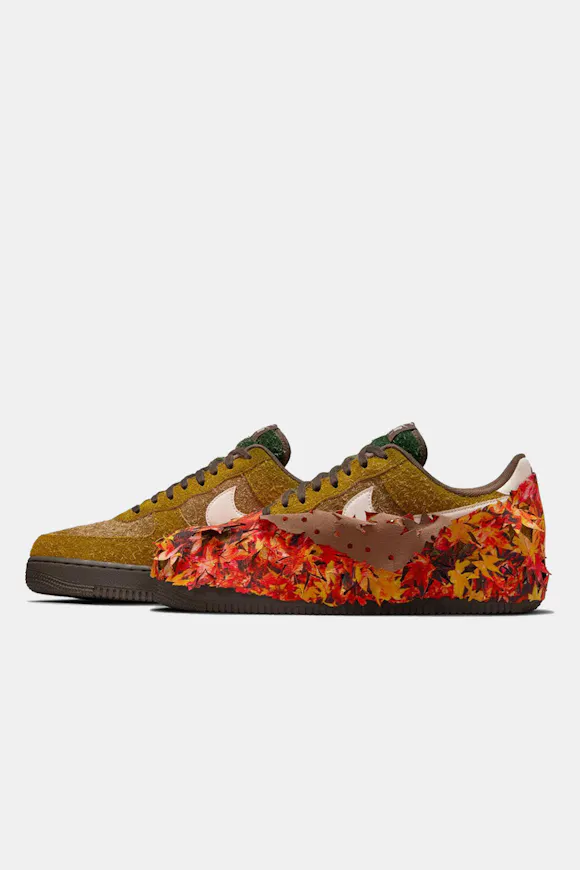 Nike men's standard fit AF1 low retro in "Flak", "Sail", "Medium Olive", and "Fir". Featuring an Autumn leaves removable overlay, Nike logo embossed on heel, and perforated toebox. Features: Padded collar Perforated toebox Nike logo patch on tongue Swoosh on lateral sides Nike logo embossed on heel Flat cotton laces Fabrication: Suede Upper Rubber outsole Style # IM8062-368 Fit: Standard fit US men's sizing