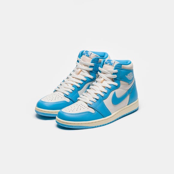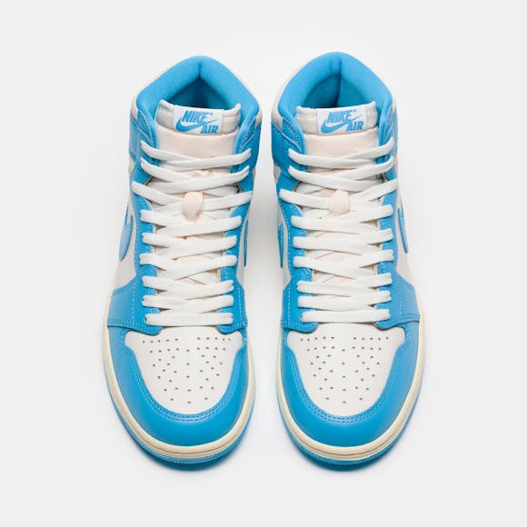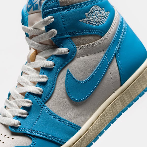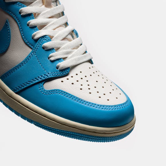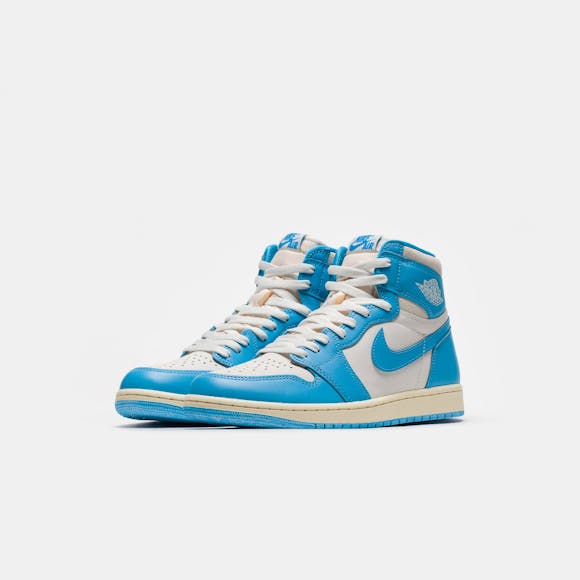 Jordan Brand men’s limited edition standard fit "Dark Powder Blue" blue and "Sail" white leather high top retro basketball sneaker. The Air Jordan 1 debuted in 1985 and has since changed the landscape of basketball footwear and sneaker culture forever. Features: Lace-up front Leather upper with signature cement elephant print Rounded toe Nylon tongue Rubber cup sole with Air-sole unit Rubber outsole with flex grooves Tonal textile lining Fabrication: Style # DZ5485-402 Made in China Fit & Sizing: Standard fit US men’s sizing