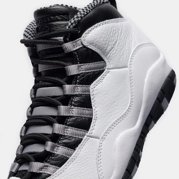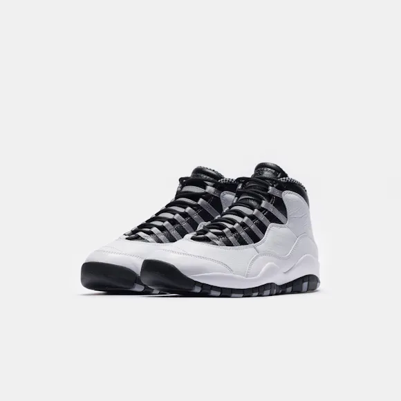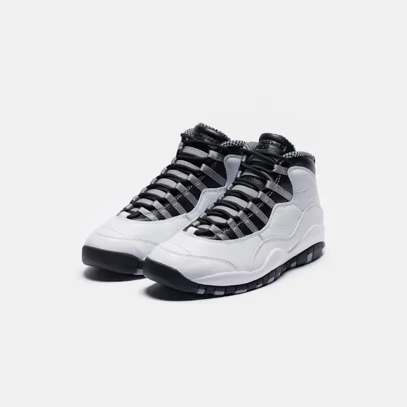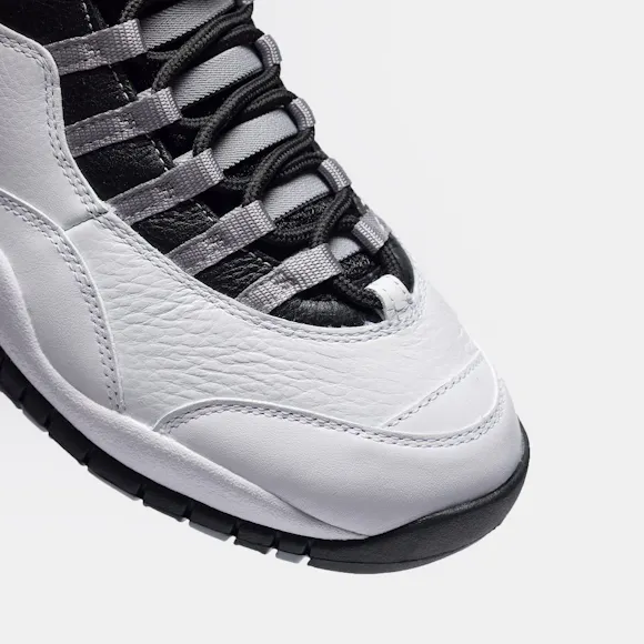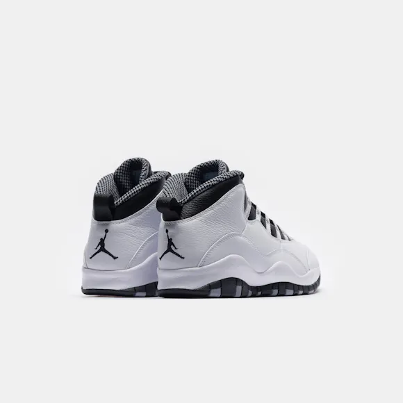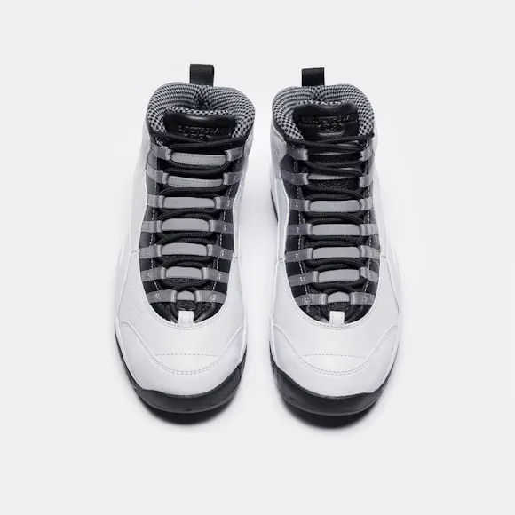Jordan Brand men’s limited edition standard fit white, black, "It Steel Grey", and "Dark Powder Blue" tumbled leather high top retro basketball sneaker. Conceptualized by legendary footwear designer Tinker Hatfield and first released in 1994, the Air Jordan 10 debuted shortly after Michael Jordan’s first retirement from the NBA and was the first Air Jordan model that Nike did not consult Jordan on its design. As a result, the original “Steel Grey” colorway featured a leather toe cap that Nike subsequently removed from future models after Jordan expressed his displeasure with the detail. Despite this small hiccup, the sneaker featured some highly technical details for its time, such a quick-lace system and a series of interior and exterior elastic bands to keep the tongue in place. Additionally, the Air Jordan 10 features a rubber outsole with Michael Jordan’s greatest accomplishments from 1985 through 1994 (since Hatfield and Nike had no idea that Jordan would come out of retirement less than two years later). Features: Lace-up front Tumbled leather upper Rounded toe Quick-lace system Padded collar Grosgrain heel pull for easy on-and-off Interior heel counter Foam midsole Rubber outsole “Court” green textile lining Fabrication: Style # HJ6779-104 Made in Vietnam Fit & Sizing: Standard fit US men’s sizing
