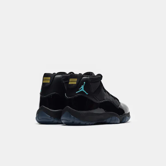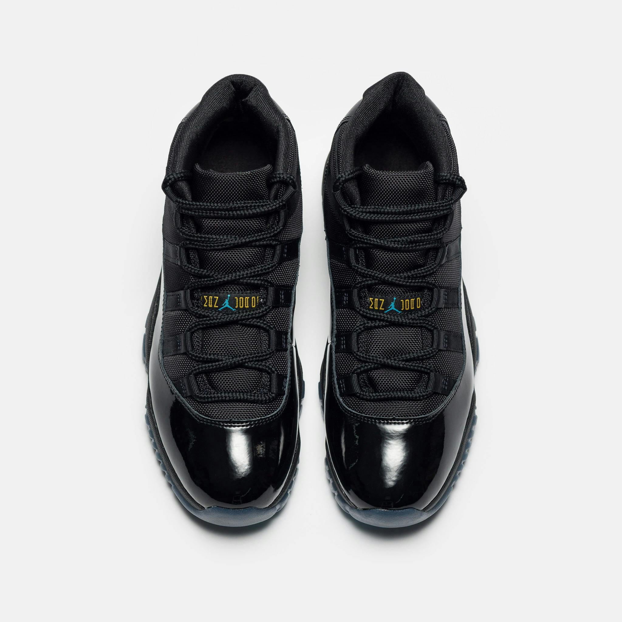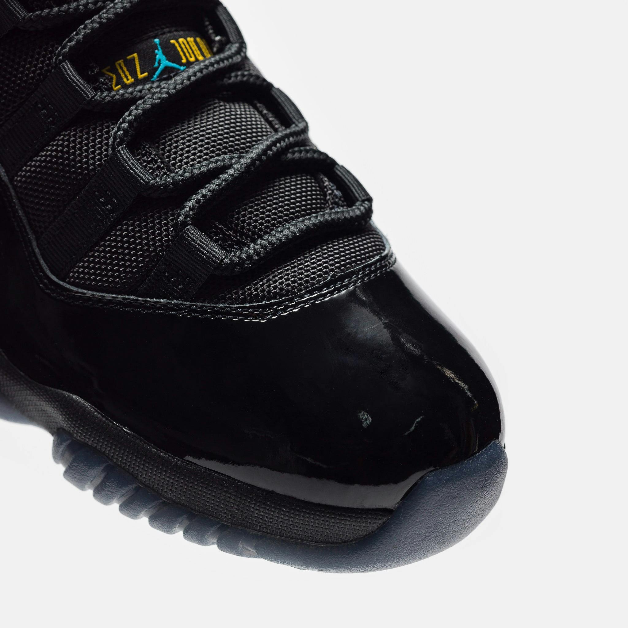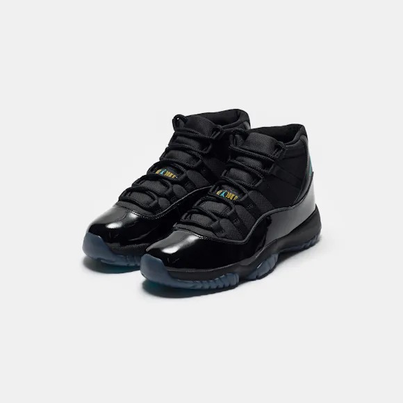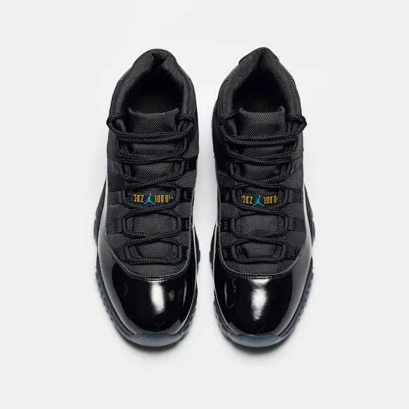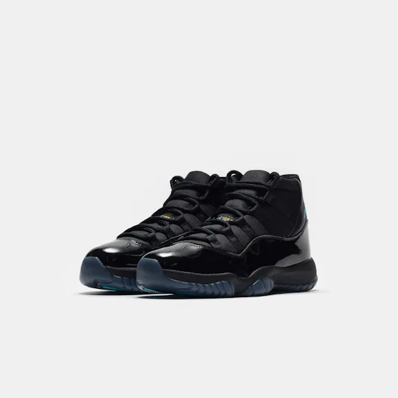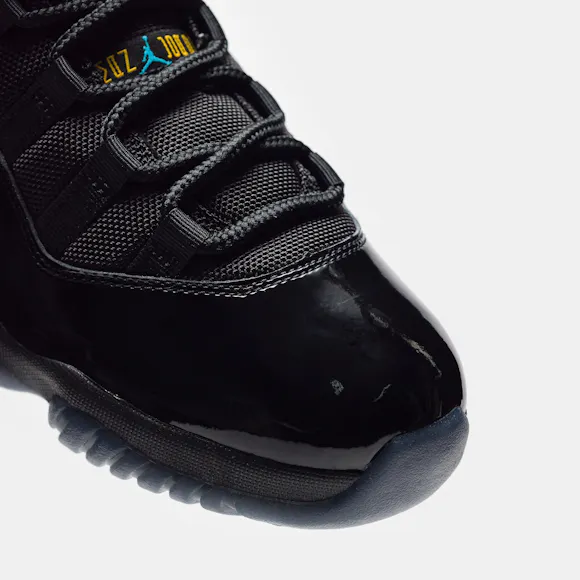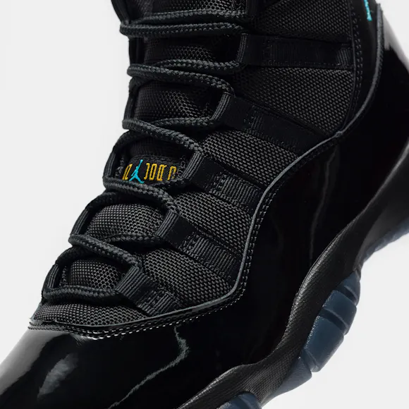 Jordan Brand men's limited edition retro basketball sneaker in black, "Gamma Blue", and "Varsity Maize" leather and patent upper. For the 1996 Air Jordan 11, legendary footwear designer Tinker Hatfield drew inspiration from convertibles and wingtips to create a basketball sneaker that would give Michael Jordan a competitive edge on the court and look beautiful off it. Jordan went on to wear the sneaker during his fourth championship run and in the legendary basketball movie Space Jam. Features: Webbed lace-up front Leather and patent upper Cutout details on upper with mesh paneling Rounded toe Foam midsole Carbon fiber shank plate Translucent rubber outsole Modified herringbone tread Tonal textile lining Fabrication: Style # CT8012-047 Made in China Fit & Sizing: Standard fit US men's sizing