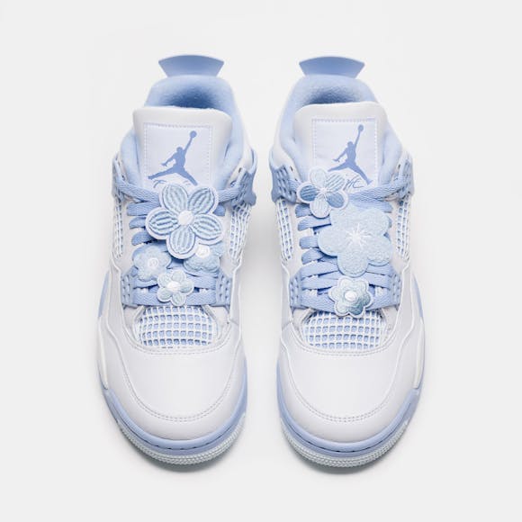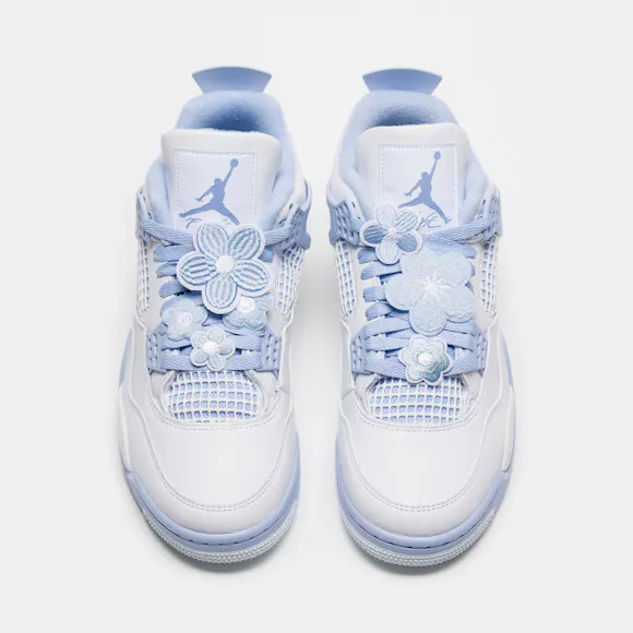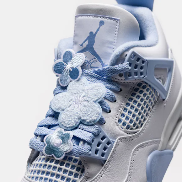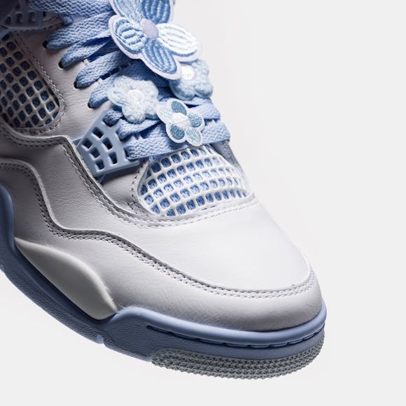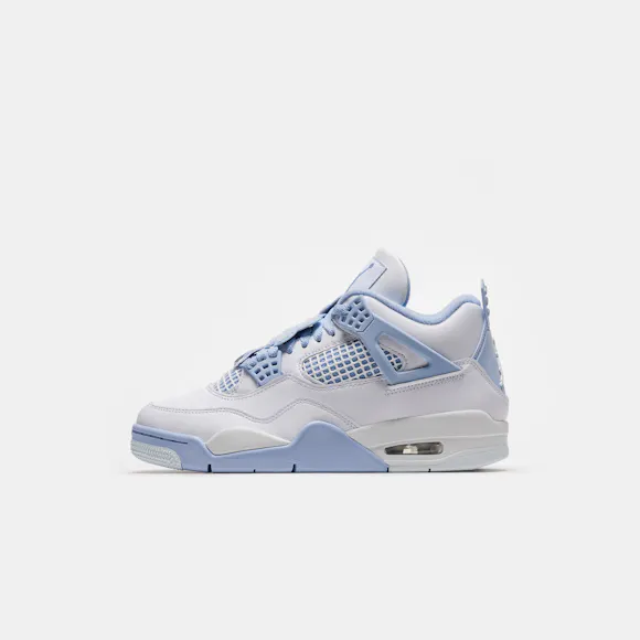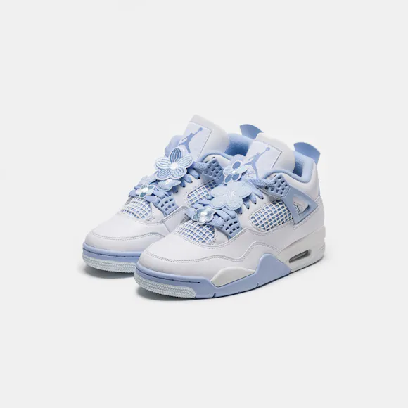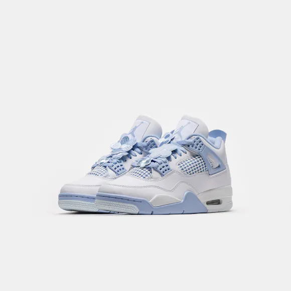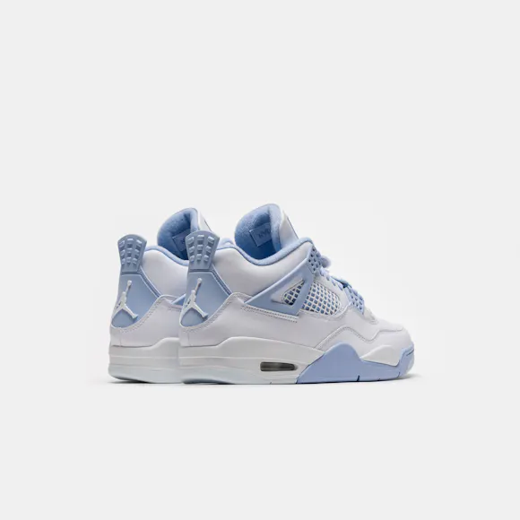 Jordan Brand women’s limited edition standard fit white, "Aluminum" grey, "Blue Tint" blue, and "Oil" green leather mid top retro basketball sneaker. First released in 1989 and designed by Tinker Hatfield, the Air Jordan 4 features rubberized plastic netting overlays, an innovative “wings” lacing system, which allows for eighteen different lacing options, floral lacing overlays, and the now-famous script “Flight” logo. Legendary not only for its design, the Air Jordan 4 quickly became a pop cultural icon on Jordan’s feet—as he wore a pair to sink “the shot” to beat the Cleveland Cavaliers in Game 5 of the 1989 Eastern Conference First Round—and off them, as the sneaker was featured in Spike Lee’s seminal film Do the Right Thing. Features: Lace-up front Leather and suede upper Rounded toe Padded collar Signature lacing “wings” Rubber and foam midsole Visible Air-sole heel unit Rubber outsole with modified herringbone tread Tonal textile lining Fabrication: Style # HV0823-100 Imported Fit & Sizing: Standard fit US women’s sizing