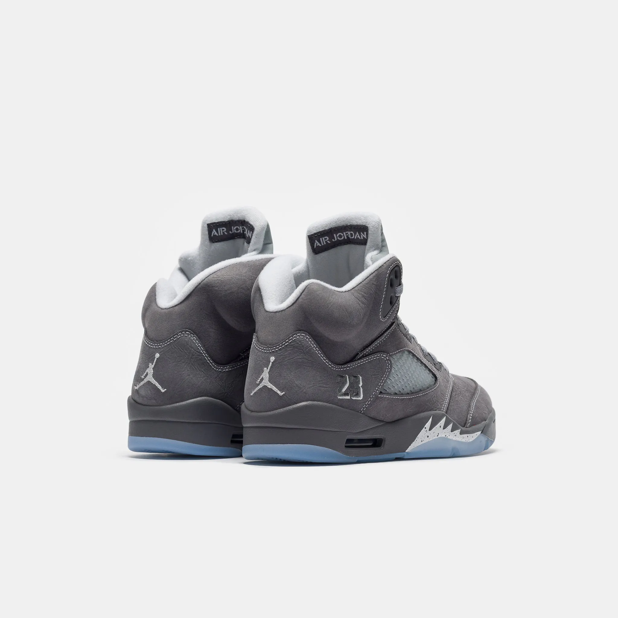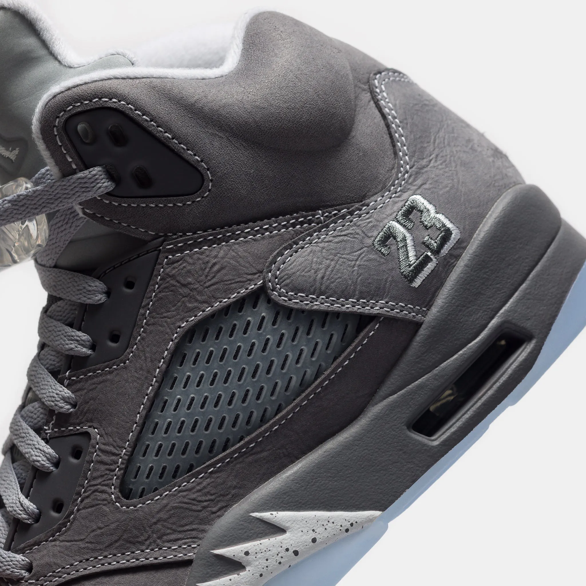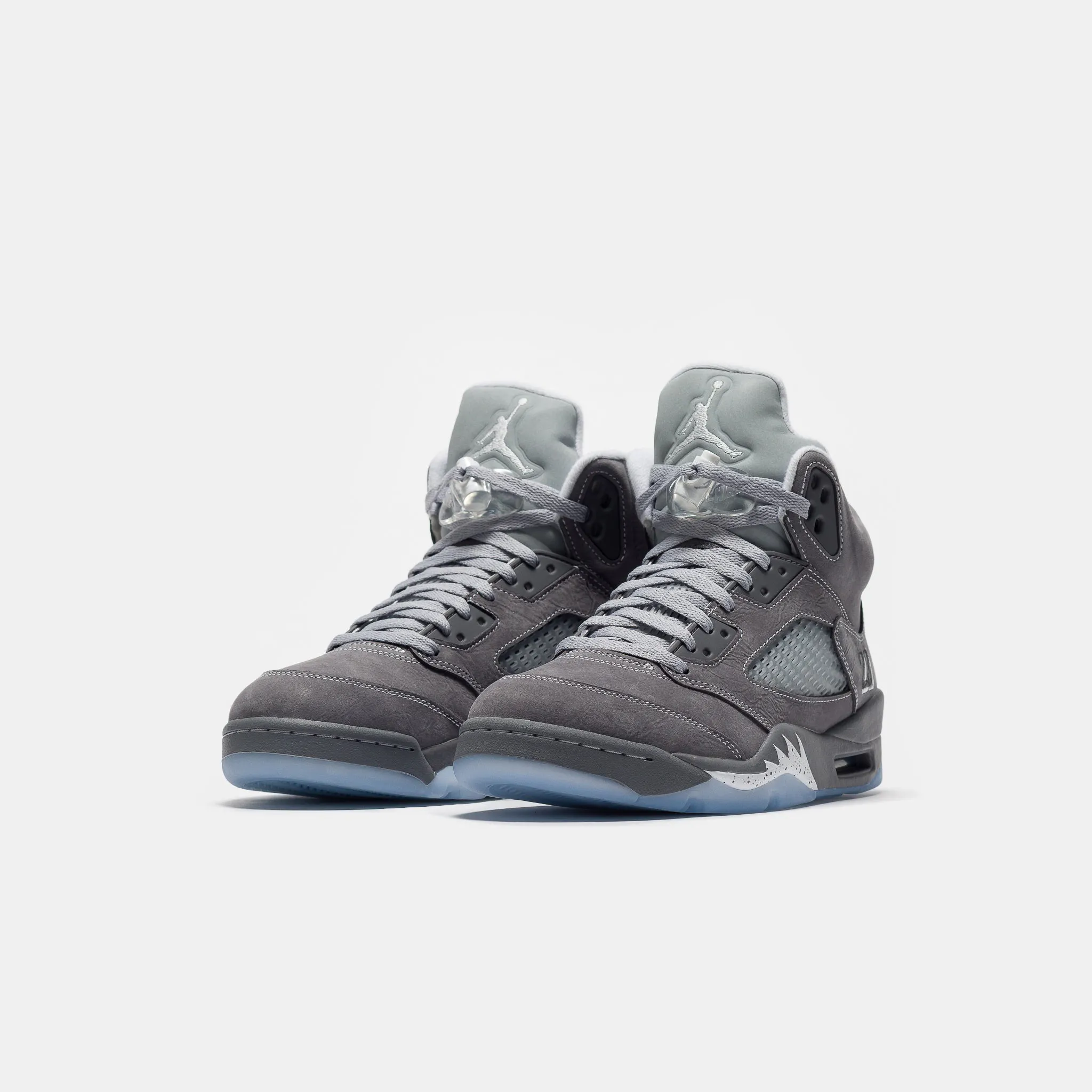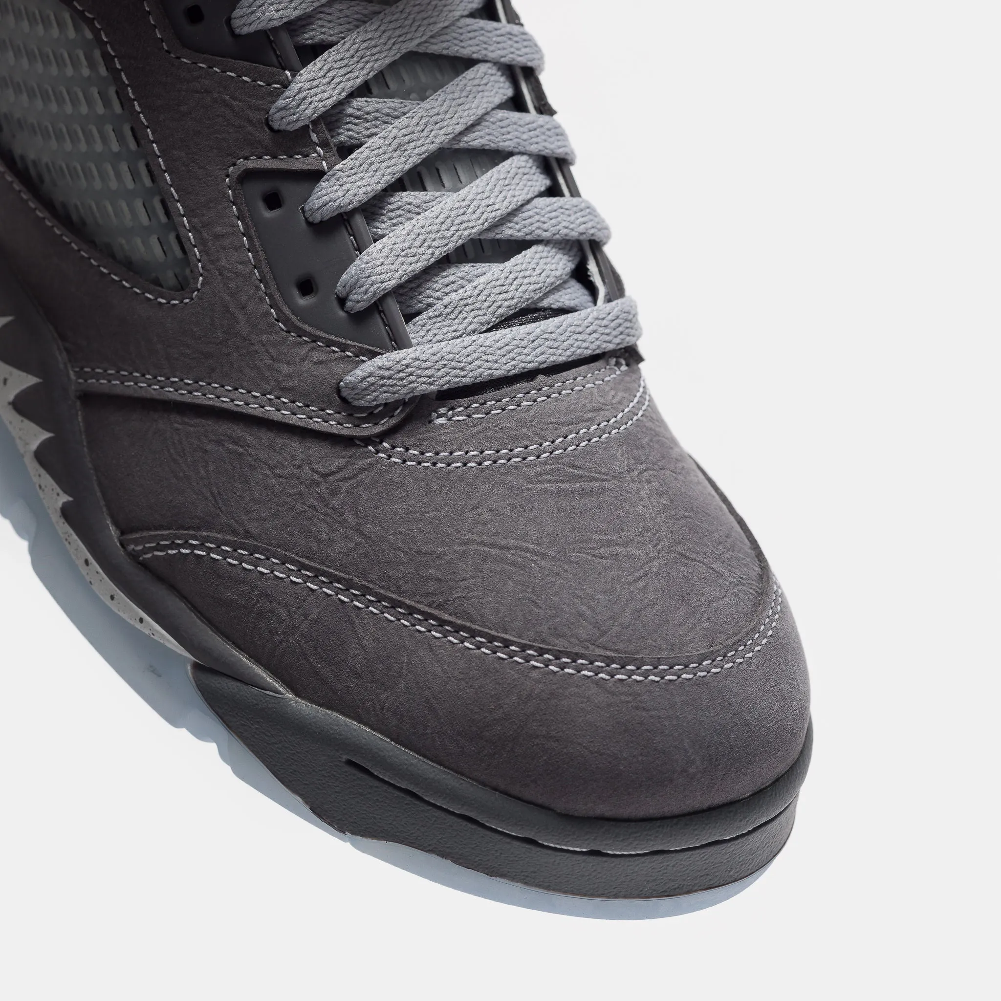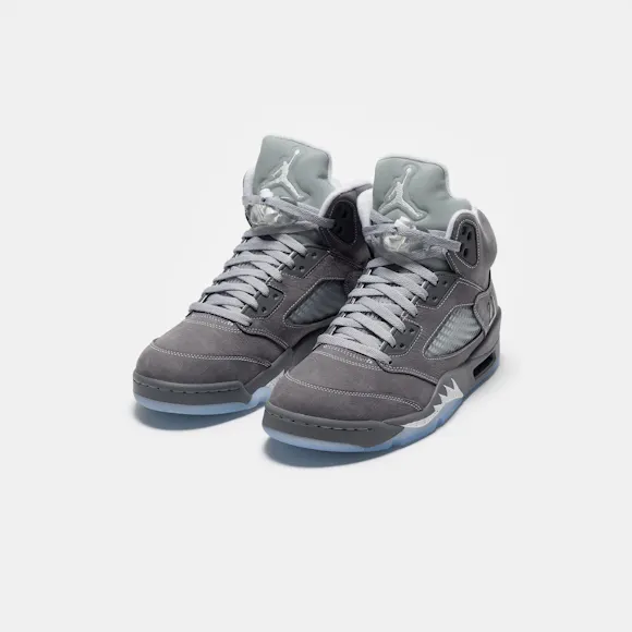 Jordan Brand men's limited edition "Light Graphite" grey, white, and "Wolf Grey" leather high top retro basketball sneaker. Originally released in 1990 and designed by legendary footwear designer Tinker Hatfield, the Air Jordan 5 features shark tooth details on the midsole inspired by the Supermarine Spitfire Mk VIII, a World War II British fighter plane, and was the first Air Jordan to sport a translucent rubber outsole. Features: Lace-up front Leather upper Rounded toe Reflective tongue Ergonomic padded collar Foam midsole Visible Air-sole heel unit Translucent rubber outsole Textile lining Fabrication: Style # DD0587-002 Fit & Sizing: Standard fit US men's sizing