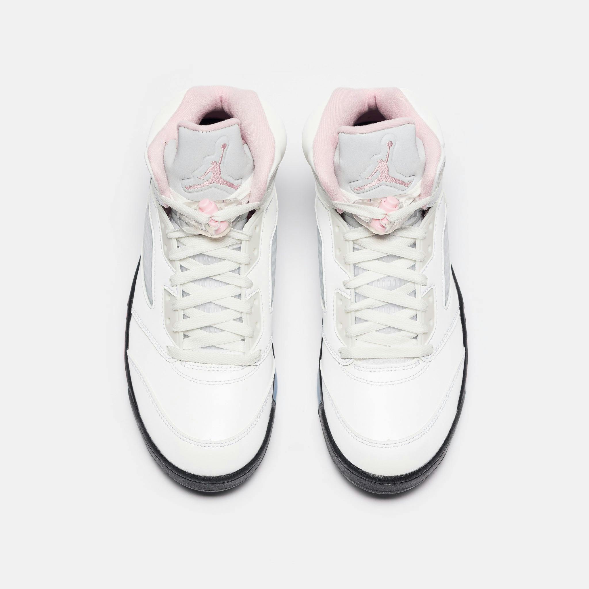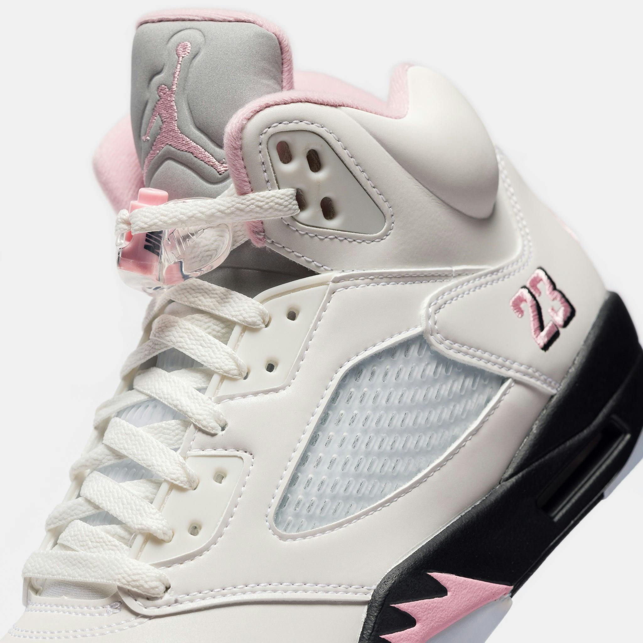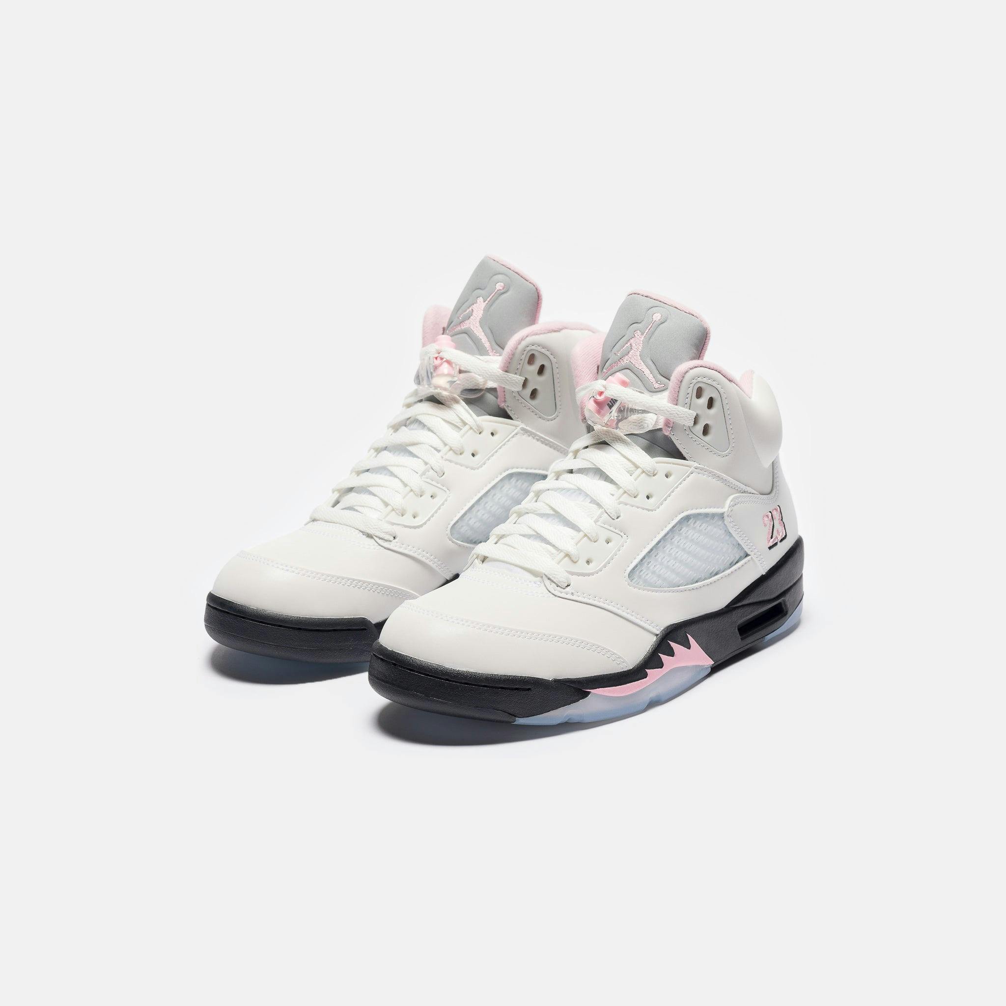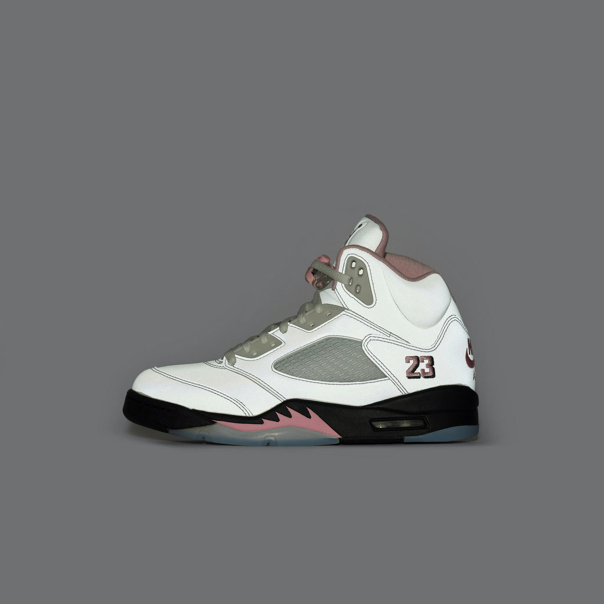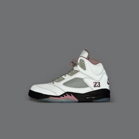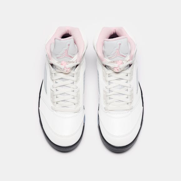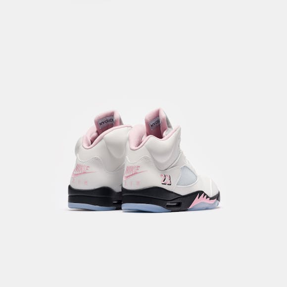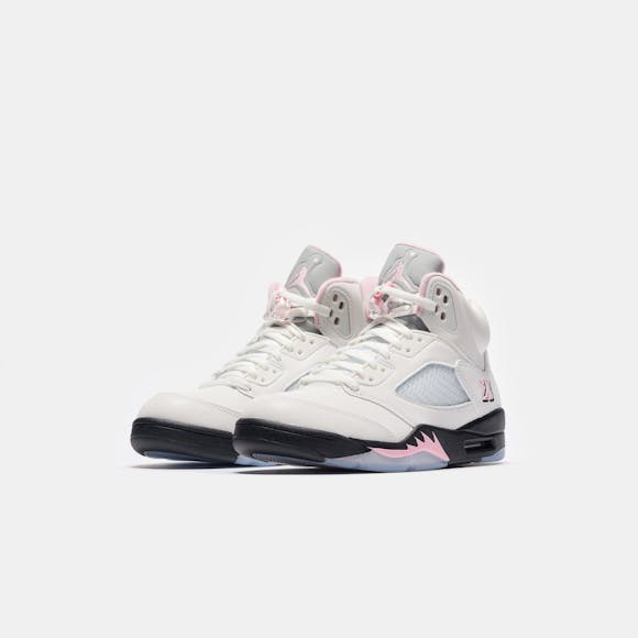 Jordan Brand men's limited edition white, "Med Soft Pink",and black leather high top retro basketball sneaker. Originally released in 1990 and designed by legendary footwear designer Tinker Hatfield, the Air Jordan 5 features shark tooth details on the midsole inspired by the Supermarine Spitfire Mk VIII, a World War II British fighter plane, and was the first Air Jordan to sport a translucent rubber outsole. Features: Lace-up front Leather upper Rounded toe Reflective tongue Ergonomic padded collar Foam midsole Visible Air-sole heel unit Translucent rubber outsole Textile lining Fabrication: Style # HQ7978-102 Fit & Sizing: Standard fit US men's sizing