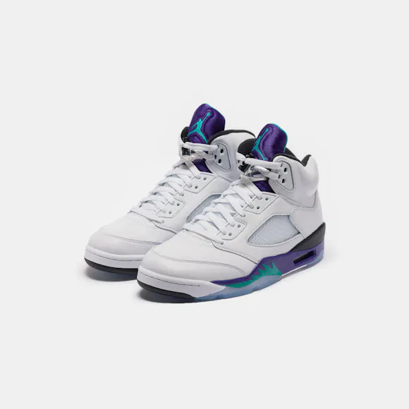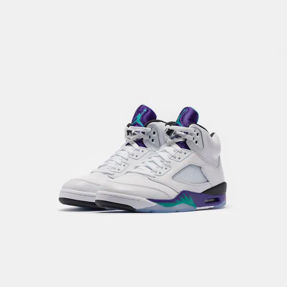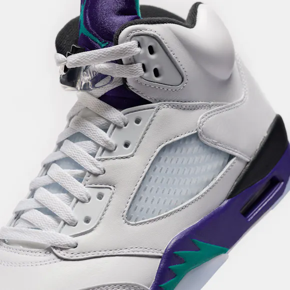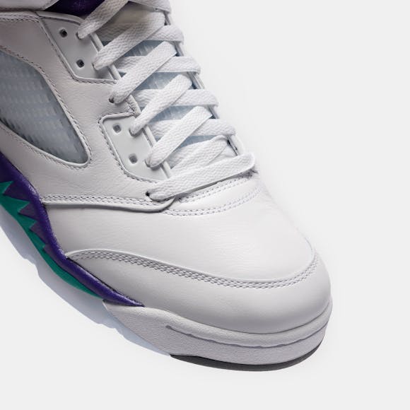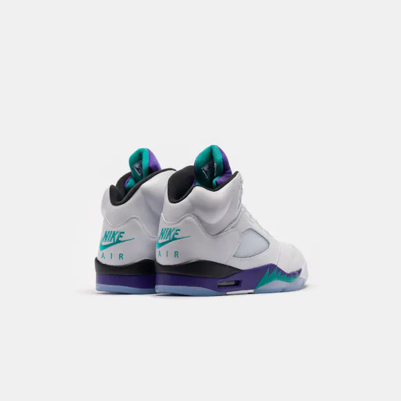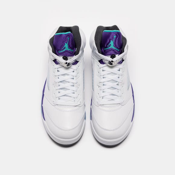 Jordan Brand men’s limited edition white, "New Emerald" green, "Grape Ice" purple, and black leather high top retro basketball sneaker. Originally released in 1990 and designed by legendary footwear designer Tinker Hatfield, the Air Jordan 5 features shark tooth details on the midsole inspired by the Supermarine Spitfire Mk VIII, a World War II British fighter plane, and was the first Air Jordan to sport a translucent rubber outsole. Features: Lace-up front Leather upper Rounded toe Reflective tongue Ergonomic padded collar Foam midsole Visible Air-sole heel unit Translucent rubber outsole Textile lining Fabrication: Style # HQ7978-100 Fit & Sizing: Standard fit US men’s sizing