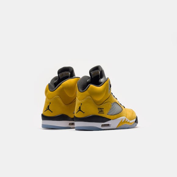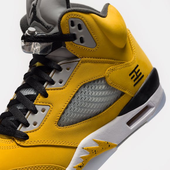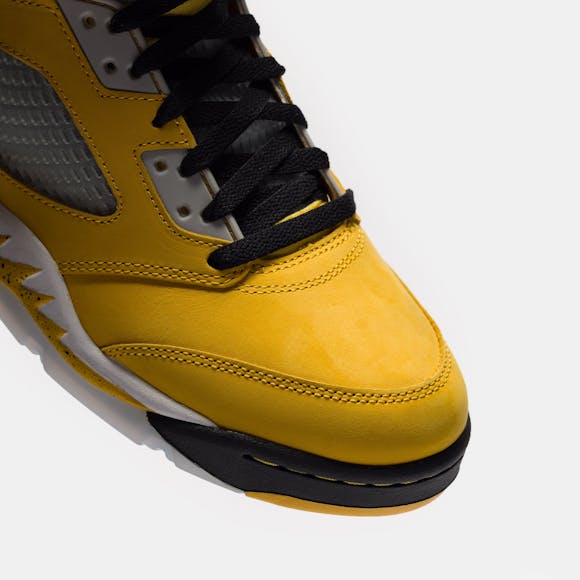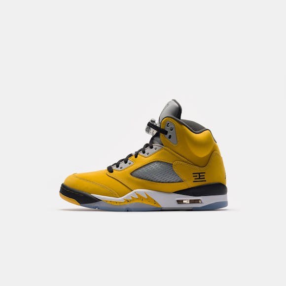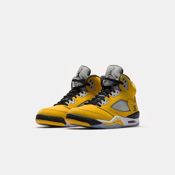 Jordan Brand men's limited edition yellow and multicolor leather high top retro basketball sneaker. Originally released in 1990 and designed by legendary footwear designer Tinker Hatfield, the Air Jordan 5 features shark tooth details on the midsole inspired by the Supermarine Spitfire Mk VIII, a World War II British fighter plane, and was the first Air Jordan to sport a translucent rubber outsole. Features: Lace-up front Leather upper Rounded toe Reflective tongue Ergonomic padded collar Foam midsole Visible Air-sole heel unit Translucent rubber outsole Textile lining Fabrication: Style # IO3372-700 Fit & Sizing: Standard fit US men's sizing