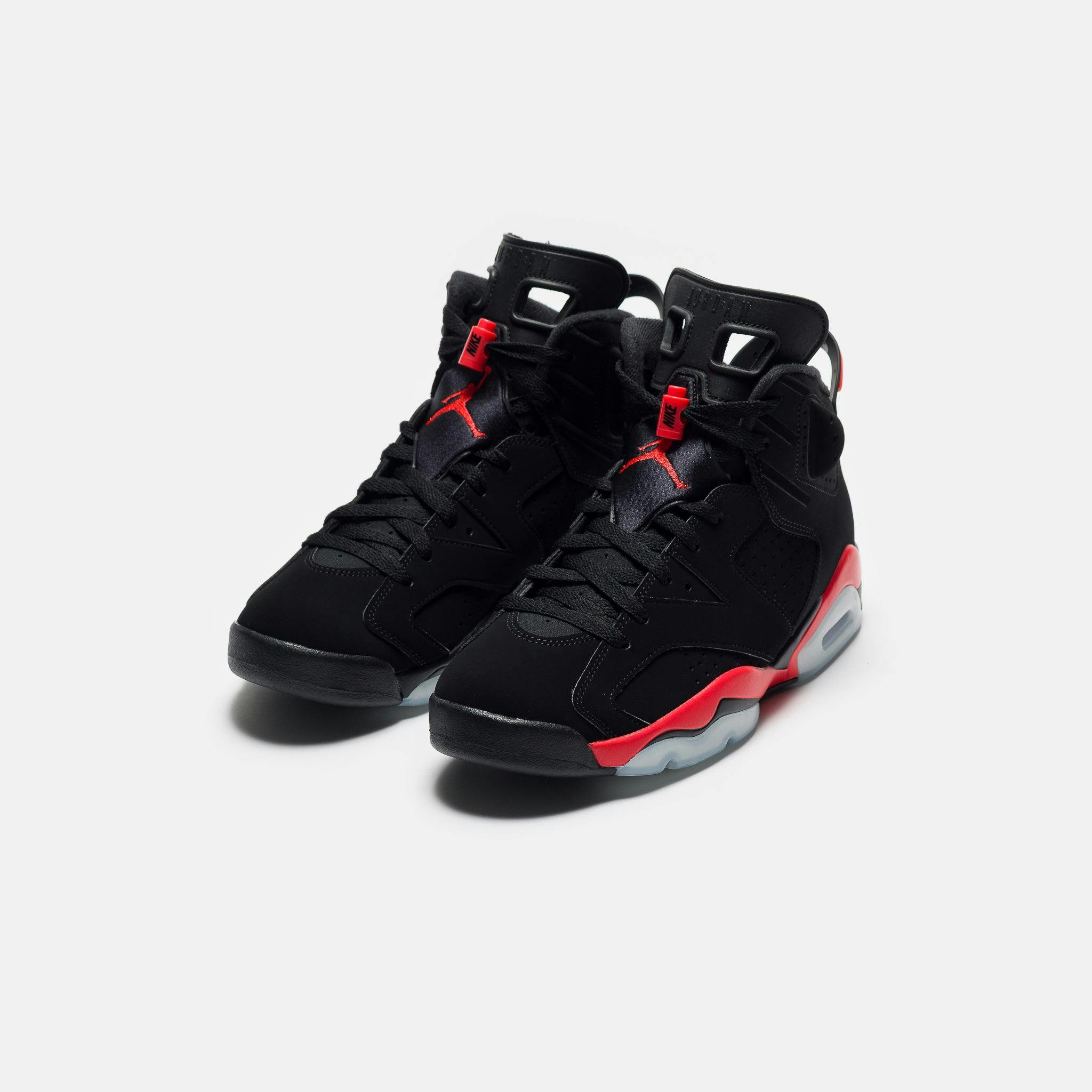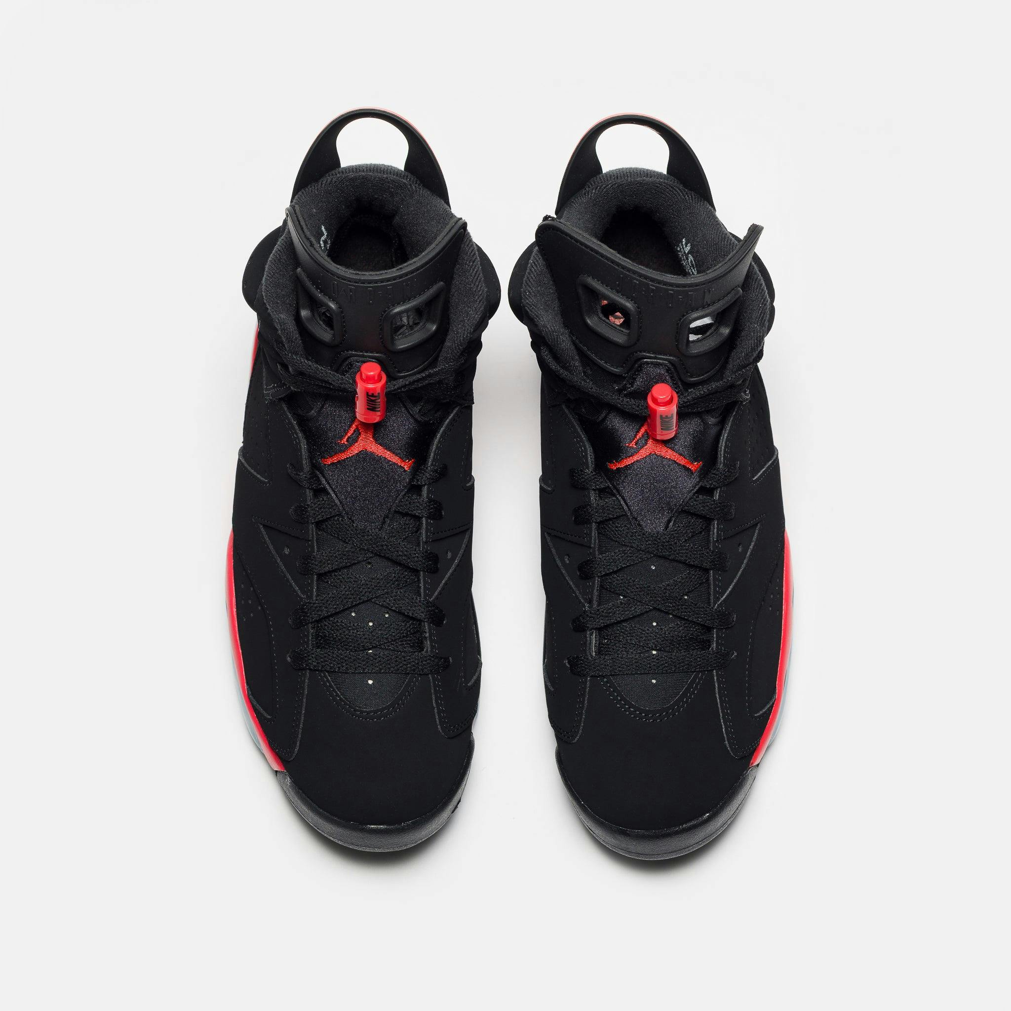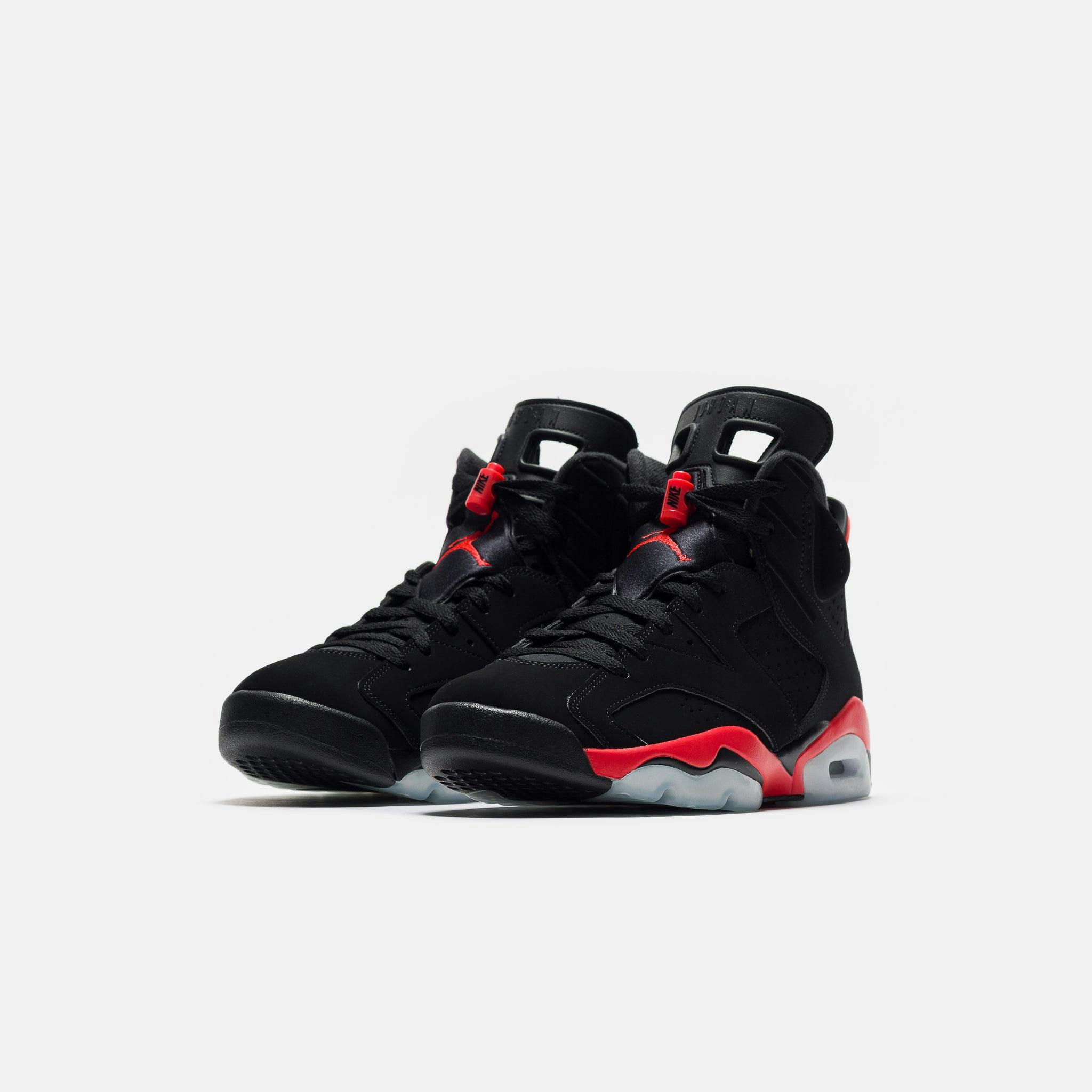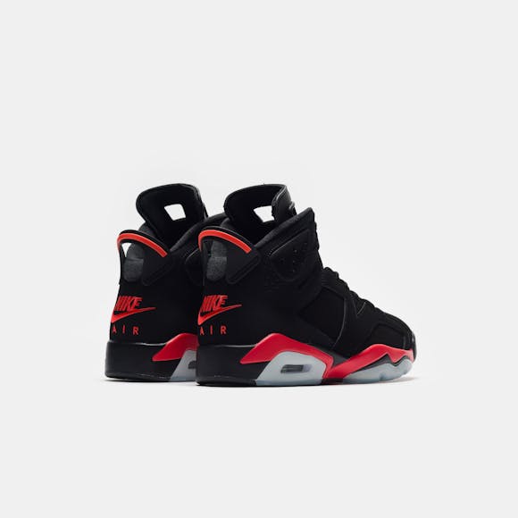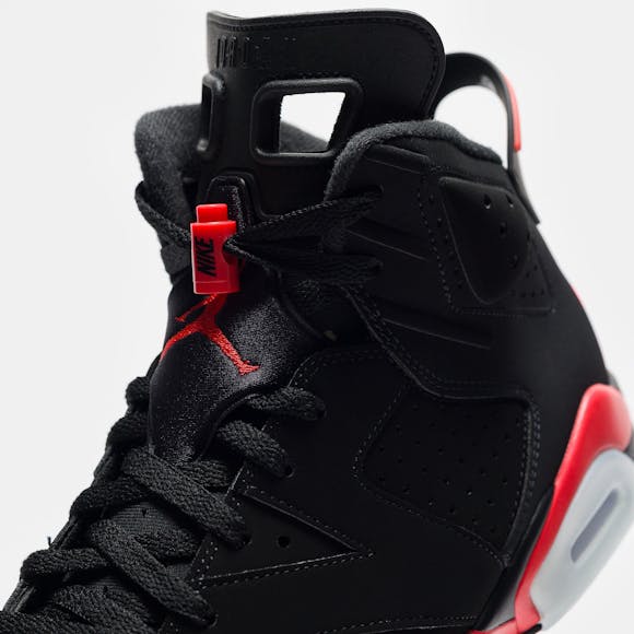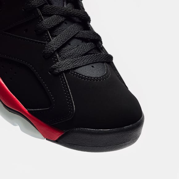 Jordan Brand men's limited edition standard fit black and “Lt. Crimson” red nubuck leather high top retro basketball sneaker. Released in 1991, the Air Jordan 6 graced Michael Jordan’s feet during his first NBA championship run the same year. The sneaker features an innovative tongue and heel pull design to make it easier to put on, as well as a molded back that lets the Achilles tendon move freely. Features: Lace-up front Nubuck leather upper Rounded toe Tongue and heel pulls for easy on-and-off Neoprene sock liner Padded collar Foam midsole with visible Air-sole unit Rubber outsole Tonal textile lining Fabrication: Style # CT8529-001 Imported Fit & Sizing: Standard fit US men's sizing