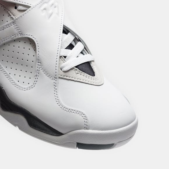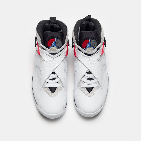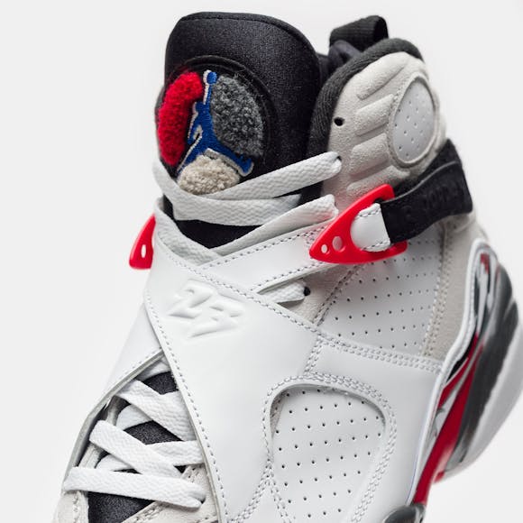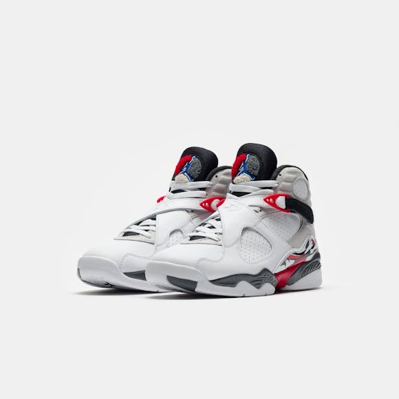 Jordan Brand men’s limited edition white, black, "True Red" leather high top retro basketball sneaker. Originally released in 1993 and designed by legendary footwear designer Tinker Hatfield, the Air Jordan 8 features tri-tone Jordan logo on the tongue, nubuck and synthetic leather upper, criss cross midfoot straps, and stretchy inner sleeve. Features: Lace-up front Leather upper Rounded toe Tri-tone Jordan logo on tongue Criss cross midfoot straps Foam midsole Rubber outsole Textile lining Fabrication: Style # 305381-100 Fit & Sizing: Standard fit US men’s sizing