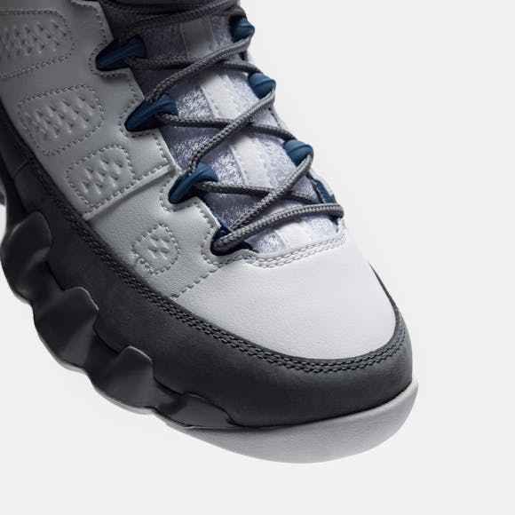 Jordan Brand grade school limited edition white, "French Blue", and "Flint Grey" leather and textile high top retro basketball sneaker. Designed by Tinker Hatfield and released in 1993 during Jordan’s first retirement from basketball, the Air Jordan 9 was influenced by the globalization of the Air Jordan brand and features details such as an embossed rubberized Jumpman globe logo on the heel and words from six different languages that describe “the sporting spirit of Michael Jordan” embossed on the outsole. Features: Ghillie lace-up front Leather and sparkle textile upper Rounded toe Dynamic-fit tongue and inner bootie Webbing tape heel pull for easy on-and-off Polyurethane midsole Encapsulated Air-sole forefoot unit Large volume Air-sole heel unit Rubber outsole Tonal textile lining Fabrication: Style # HV4574-100 Made in Vietnam Fit & Sizing: Standard fit US youth sizing