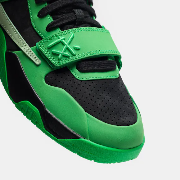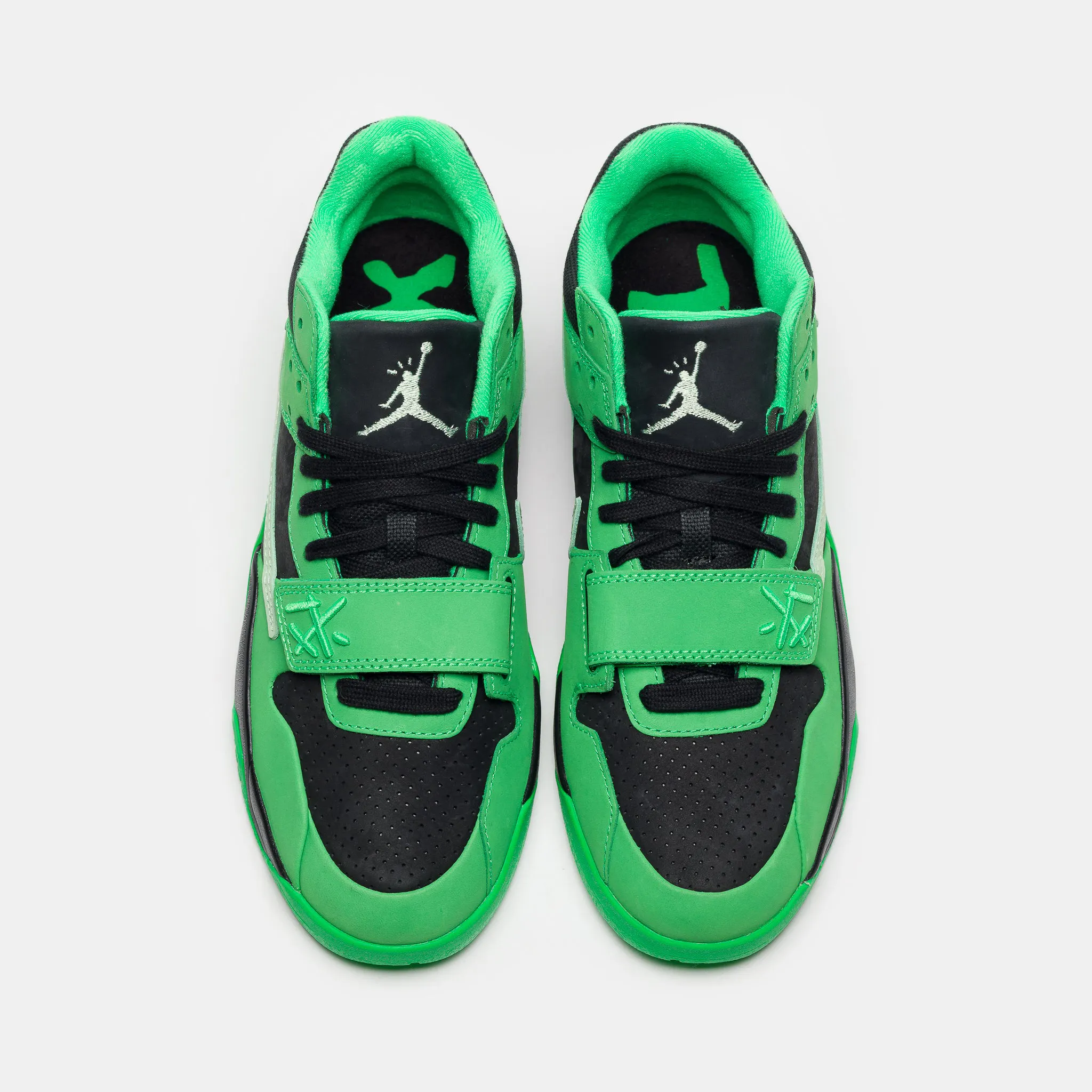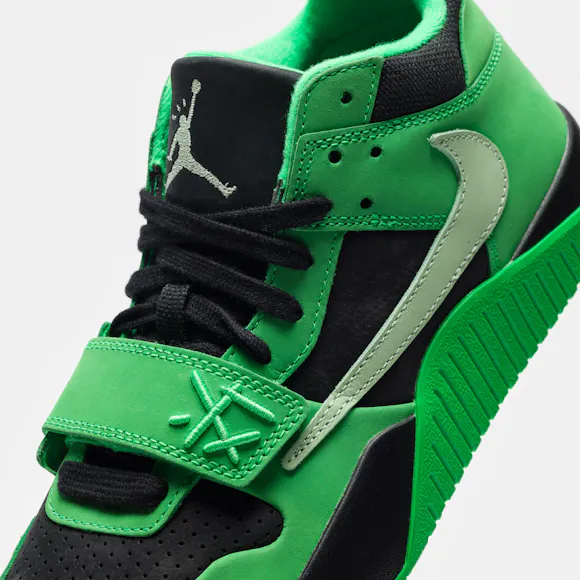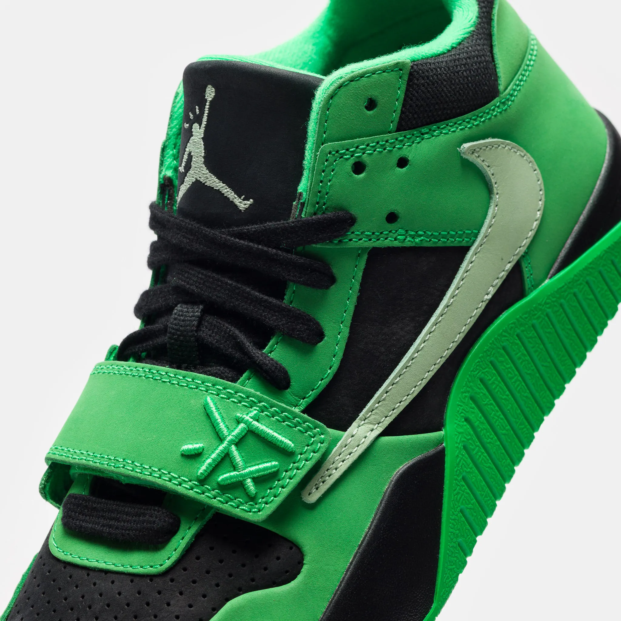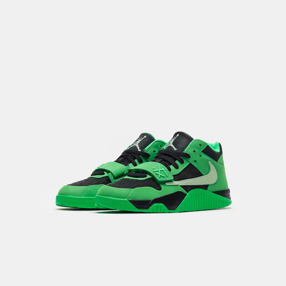 Jordan Brand x Travis Scott men’s limited edition standard fit "Green Spark", "Vapor Green Silver", and black leather mid top sneaker. Rapper, singer, and producer Travis Scott teams up with Jordan Brand once again with the artist's signature shoe. The inverted low top version of the model makes use of the same iconic “Backward Swoosh” as well as multiple Cactus Jack emblems throughout. Features: Lace-up front Suede and leather upper Rounded toe Backward Swoosh branding Signature logo on heel counter quick-to-secure strap Black textile lining Fabrication: Style # IM9113-300 Made in China Fit & Sizing: Standard fit US men’s sizing