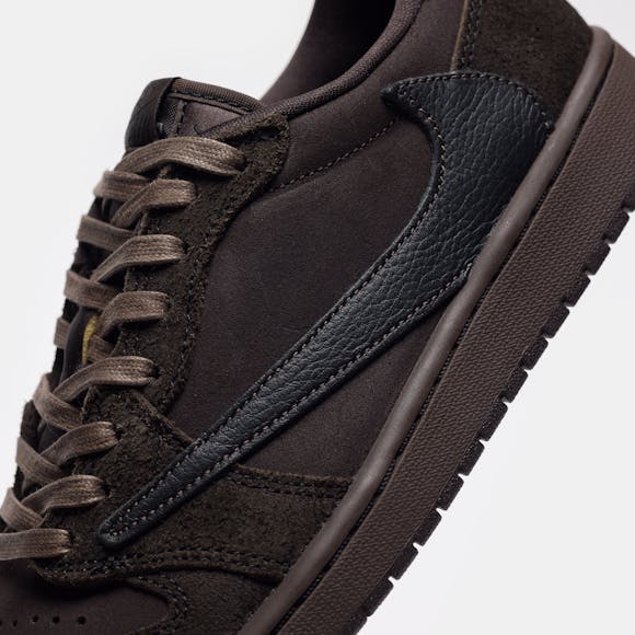 Jordan x Travis Scott Cactus Jack Air Jordan 1 Low OG SP in Dark Mocha/Black/Velvet Brown low top sneaker. Oiled suede upper.