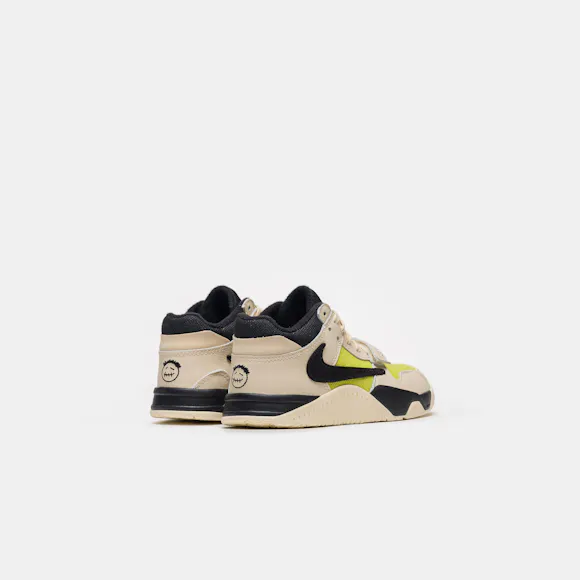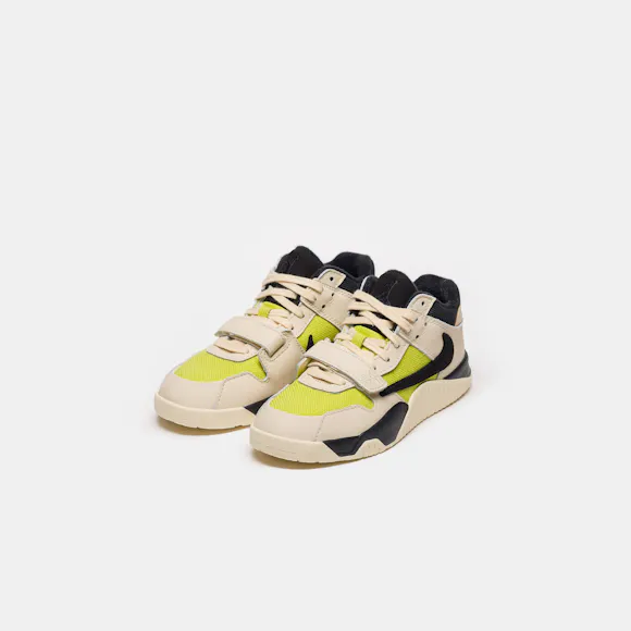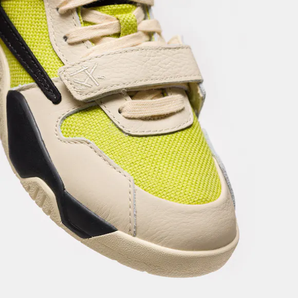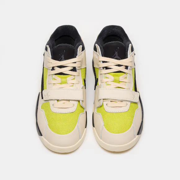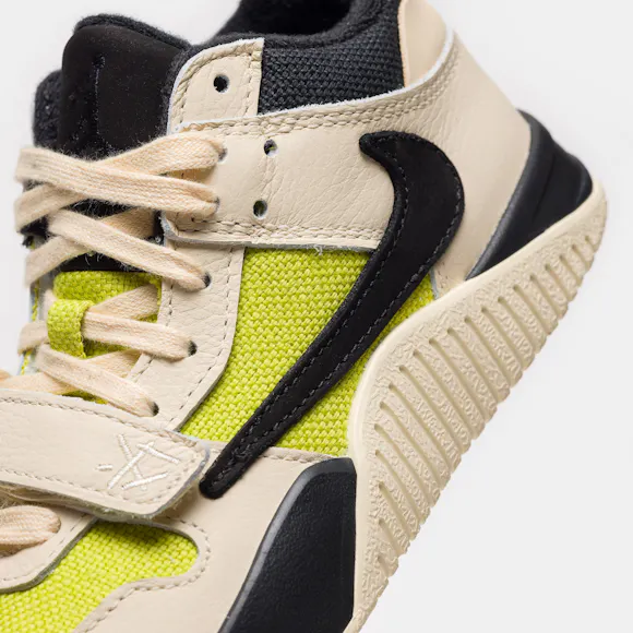 Jordan Brand x Travis Scott kids limited edition standard fit “Muslin” cream, black, "Bright Cactus" green leather mid top sneaker. Rapper, singer, and producer Travis Scott teams up with Jordan Brand once again with the artist's signature shoe. The inverted low top version of the model makes use of the same iconic “Backward Swoosh” as well as multiple Cactus Jack emblems throughout. Features: Lace-up front Suede and leather upper Rounded toe Backward Swoosh branding Signature logo on heel counter quick-to-secure strap Black textile lining Tote bag included Cream and black laces included Fabrication: Style # FJ2851-102 Made in China Fit & Sizing: Standard fit US kids sizing