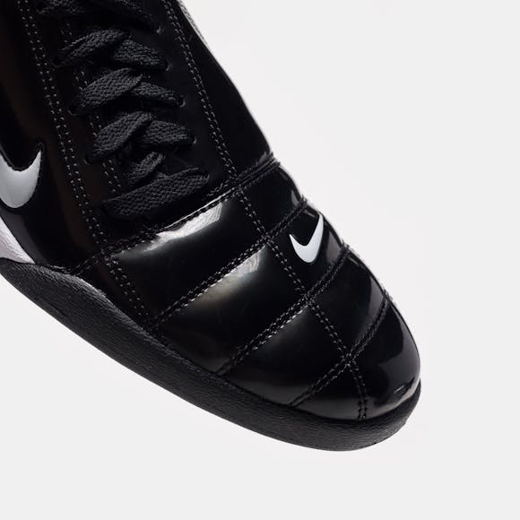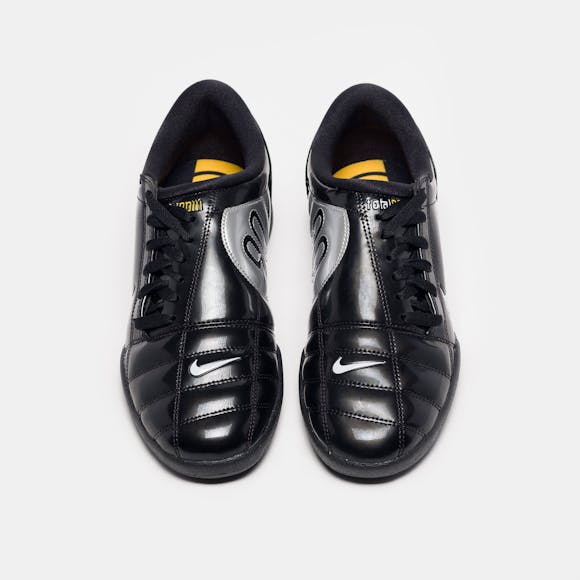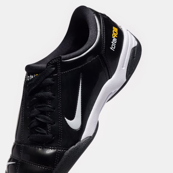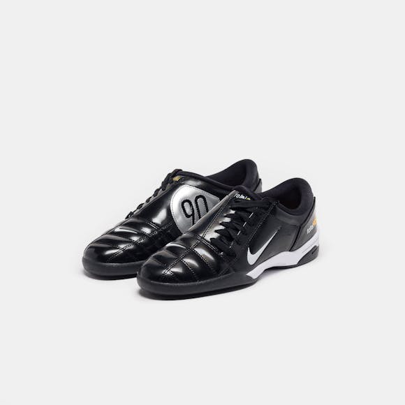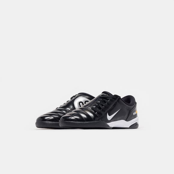 Nike men's limited edition standard fit black, white, and "Metallic Silver" silver leather low-top retro soccer sneaker. Features: Lace-up front Asymmetrical lacing Plush padded collar Nike swoosh on lateral side Signature 90 logo on medial side Rubber outsole Fabrication: Leather upper Rubber midsole Style # HJ9351-001 Fit & Sizing: Standard fit US men's sizing