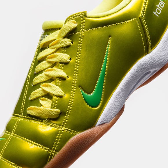 Nike men's limited edition standard fit "Dynamic" yellow, "Spark" green, and "Medium" brown leather low-top retro soccer sneaker. Features: Lace-up front Asymmetrical lacing Plush padded collar Nike swoosh on lateral side Signature 90 logo on medial side Rubber outsole Fabrication: Leather upper Rubber midsole Style # HJ9351-700 Fit & Sizing: Standard fit US men's sizing