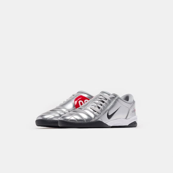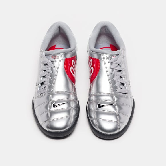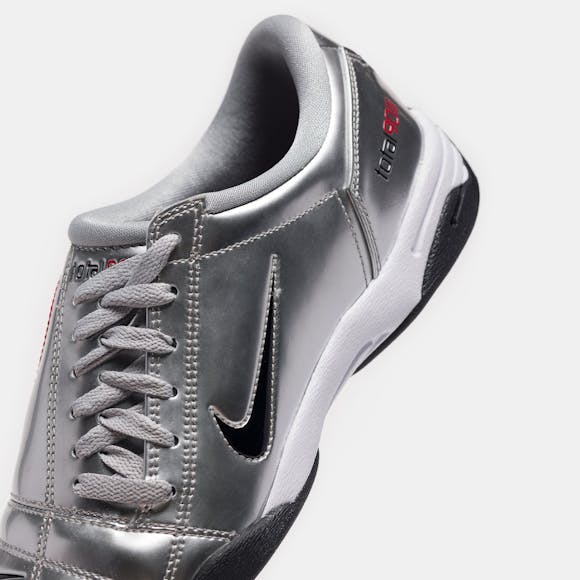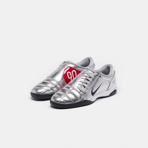 Nike men's limited edition standard fit "Metallic Silver" silver, black, and "University Red" red leather low-top retro soccer sneaker. Features: Lace-up front Asymmetrical lacing Plush padded collar Nike swoosh on lateral side Signature 90 logo on medial side Rubber outsole Fabrication: Leather upper Rubber midsole Style # HJ9351-002 Fit & Sizing: Standard fit US men's sizing