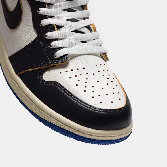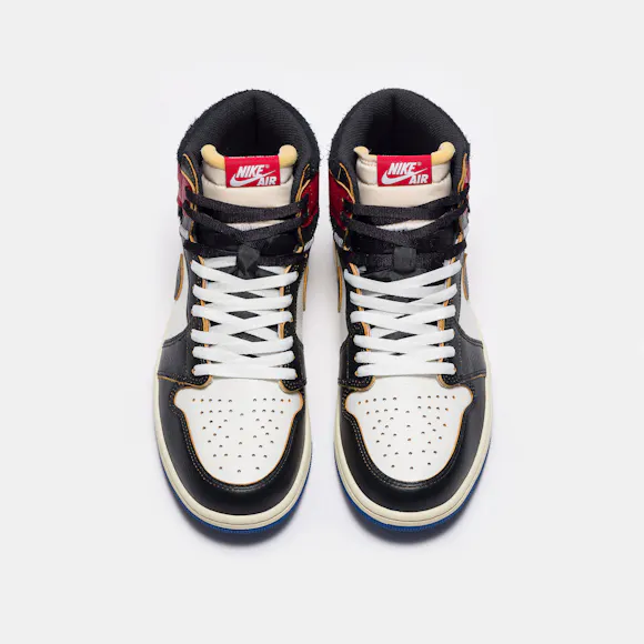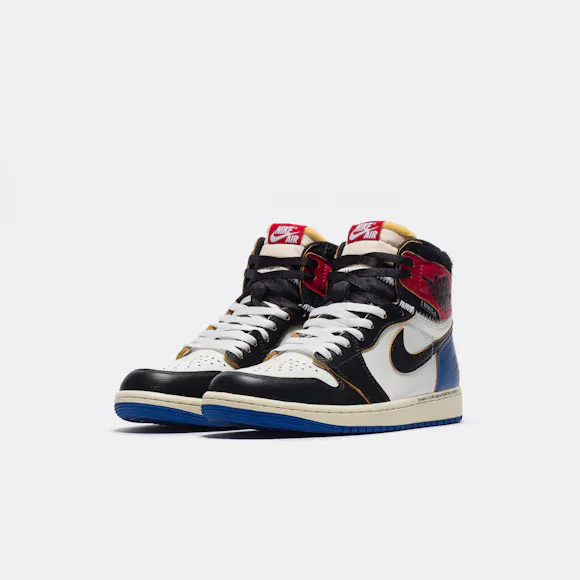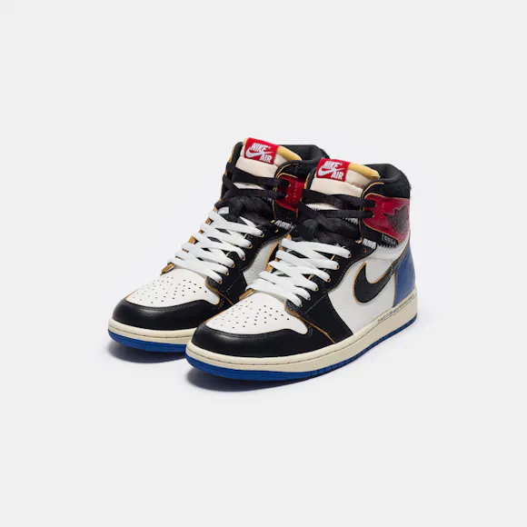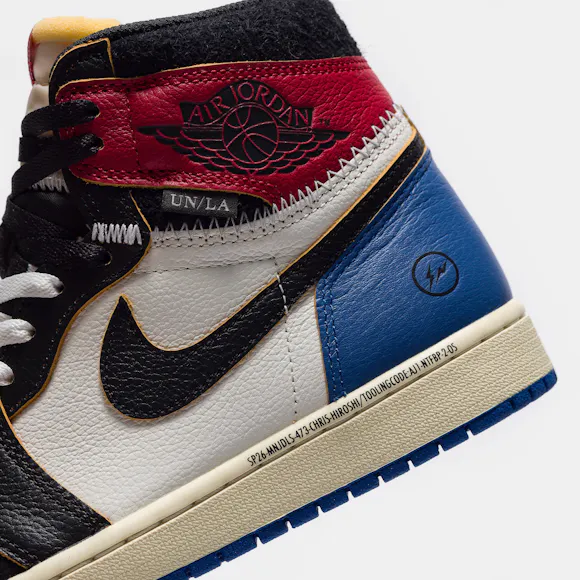 Union x Fragment x Jordan Brand men's limited edition standard fit black, white, "Varsity Red", and "Sport Royal" blue leather high top retro basketball sneaker. The Air Jordan 1 debuted in 1985 and has since changed the landscape of basketball footwear and sneaker culture forever. Features: Lace-up front Leather upper with signature cement elephant print Rounded toe Nylon tongue Rubber cup sole with Air-sole unit Rubber outsole with flex grooves Tonal textile lining Fabrication: Style # IO7847-002 Made in China Fit & Sizing: Standard fit US men's sizing